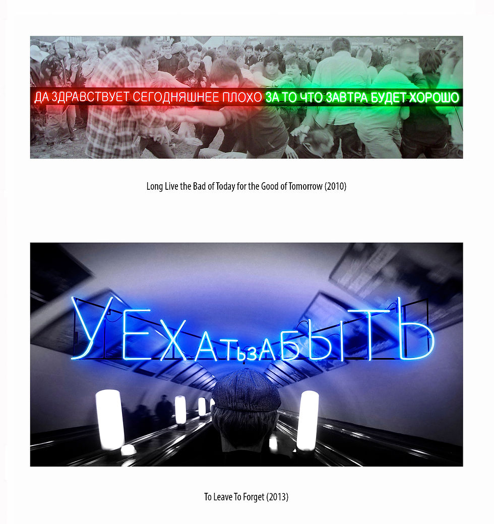 Bratkov’s second decade in Moscow saw a significant body of works in which images were juxtaposed with neon-light texts to create ambivalent tensions and mental ruptures. The first, produced in 2010, consisted of the neon slogan Long Live the Bad of Today for the Good of Tomorrow set against a panoramic image of a raucous social gathering — a Soviet propaganda slogan curiously reincarnated in the late Putin era. Yet the darker the decade became, the emptier Bratkov’s images appeared, while their messages and neon-lit nerve grew increasingly intense. Significantly, many works from this period aesthetically echo the conceptual, imperative, text-based paintings of the influential non-official artist Eric Bulatov, who explored similar notions of deadlock, escape, and freedom in the late Soviet era of stagnation. For instance, To Leave To Forget addressed the mounting dilemma of the time between literal and ‘internal’ migration. Apparently responding to Putin’s notorious claim “we are not there” (regarding the annexation of Crimea), We Are Not Here suggested a broader ethical, social, and historical disorientation. In turn, The Good Buys Evil (based on The Moscow Times) commented on the cynical subversion of values, while The Age of Loneliness conveyed an increasing sense of helplessness and solitude in the face of an impending, larger-than-life catastrophe.